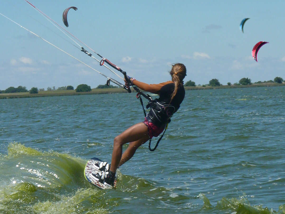 El kitesurf te permite navegar sobre el agua con una tabla, impulsado por una cometa (kite) que controlas con cuerdas. Es una forma emocionante de disfrutar de la naturaleza y hacer ejercicio al mismo tiempo.